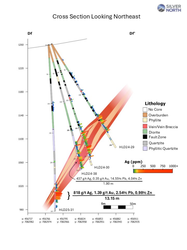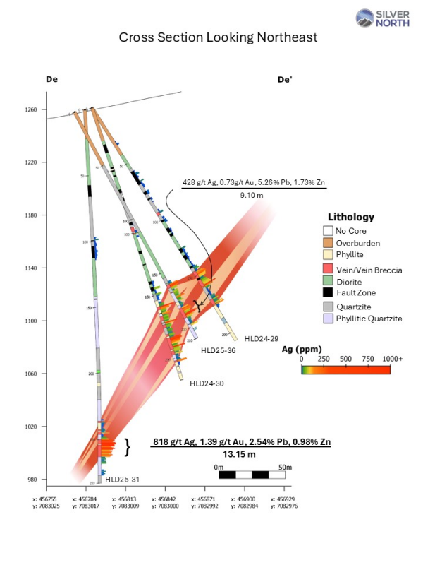 HLD25-36 intersected two splays of the Main Fault over 31 metres, starting at 161.0 m, separated by 18.25 metres of weaker structurally influenced quartzite, phyllitic quartzite, and phyllite with anomalous silver between the upper and lower splay. The entire 161.00 to 192.00 metres returned 174 g/t silver, 0.26 g/t gold, 1.68% lead and 0.64% zinc. The upper splay, from 161.00 to 164.15 returned 3.15 m averaging 228 g/t silver, 0.10 g/t gold, 0.48% lead and 0.45% zinc, while the more strongly mineralized lower splay averaged 428 g/t silver, 0.73 g/t gold, 5.26% lead and 1.73% zinc over 9.10 metres starting at 182.4 m down hole. A high-grade section of this interval, from 188.00 to 190.80 m averaged 1,069 g/t silver, 1.41 g/t gold, 12.60% lead and 3.02% zinc over 2.80 metres.