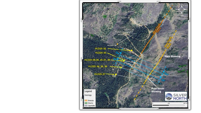 HLD25-38 intersected multiple mineralized intervals starting at 177.00 metres depth. A 1.50 metre section of brecciated vein material returned 406 g/t silver, 0.10 g/t gold, 3.13% lead and 0.18% zinc overlying 17.80 metres of quartzite, minor vein breccia and phyllitic quartzite anomalous in silver, lead and zinc from 178.50 to 196.30 metres. The lower section of Main Fault mineralization was intersected from 196.30 to 218.30 metres, a 22 metre zone which includes a 1.90 metre strongly mineralized section averaging 437 g/t silver, 0.35 g/t gold, 14.55% lead and 4.04% zinc.