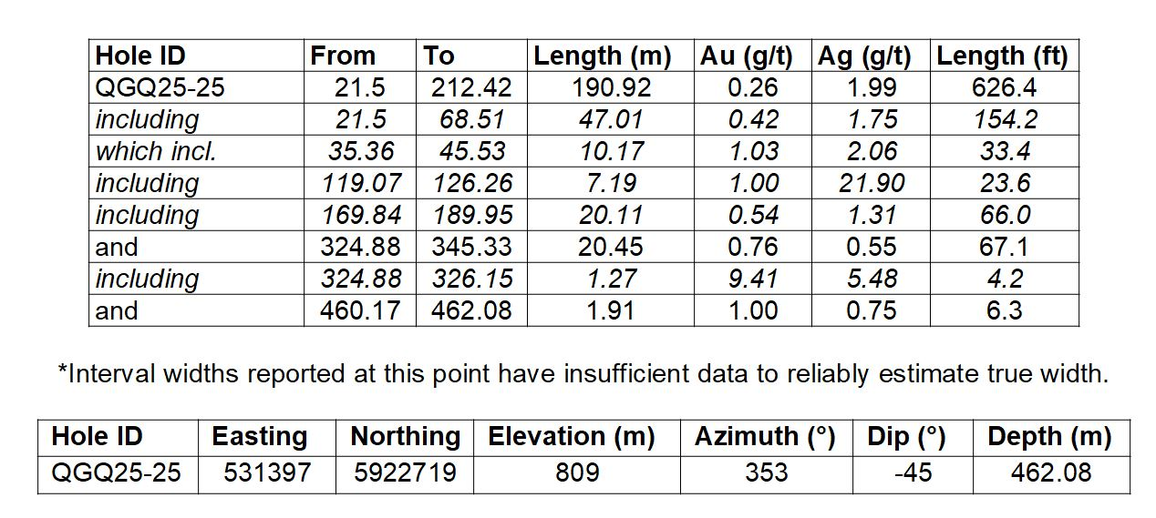 Diamond drill hole QGQ25-25 is a step out in the Halo zone, with the collar being 96m to the north-northeast of QGQ24-20, which returned 0.99 g/t Au and 9.77 g/t Ag over 236.88m (LINK). QGC25-28, an 80m step north of diamond drill hole QGQ25-25, is currently being extended to target depth, intersecting extensive quartz-carbonate veins as seen in Photo 1 on the following page.