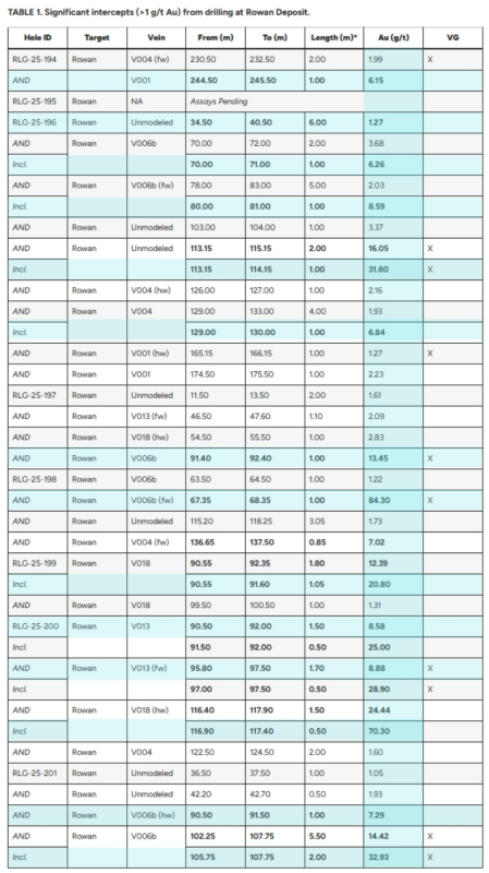 *The “From-To” intervals in Table 1 are denoting overall downhole length of the intercept. True thickness has not been calculated for these intercepts but is expected to be ≥ 70% of downhole core length based on intercept angles observed in the drill core. Internal dilution for composite intervals does not exceed 1m for samples grading <0.1 g/t Au. The “VG” column indicates the presence of Visible Gold as observed by the core logging geologist. The (hw) and (fw) notes under “Domain” column are indicating position of grade intercept “hangingwall” or “footwall”, respectively, to primary vein domain. Vein intercepts currently defined as “Unmodeled” may be incorporated into new vein domains in upcoming MRE update for Rowan. Hole RLG-25-195 has assays pending due to mineralized intervals from that hole being sent out for geotechnical testing.