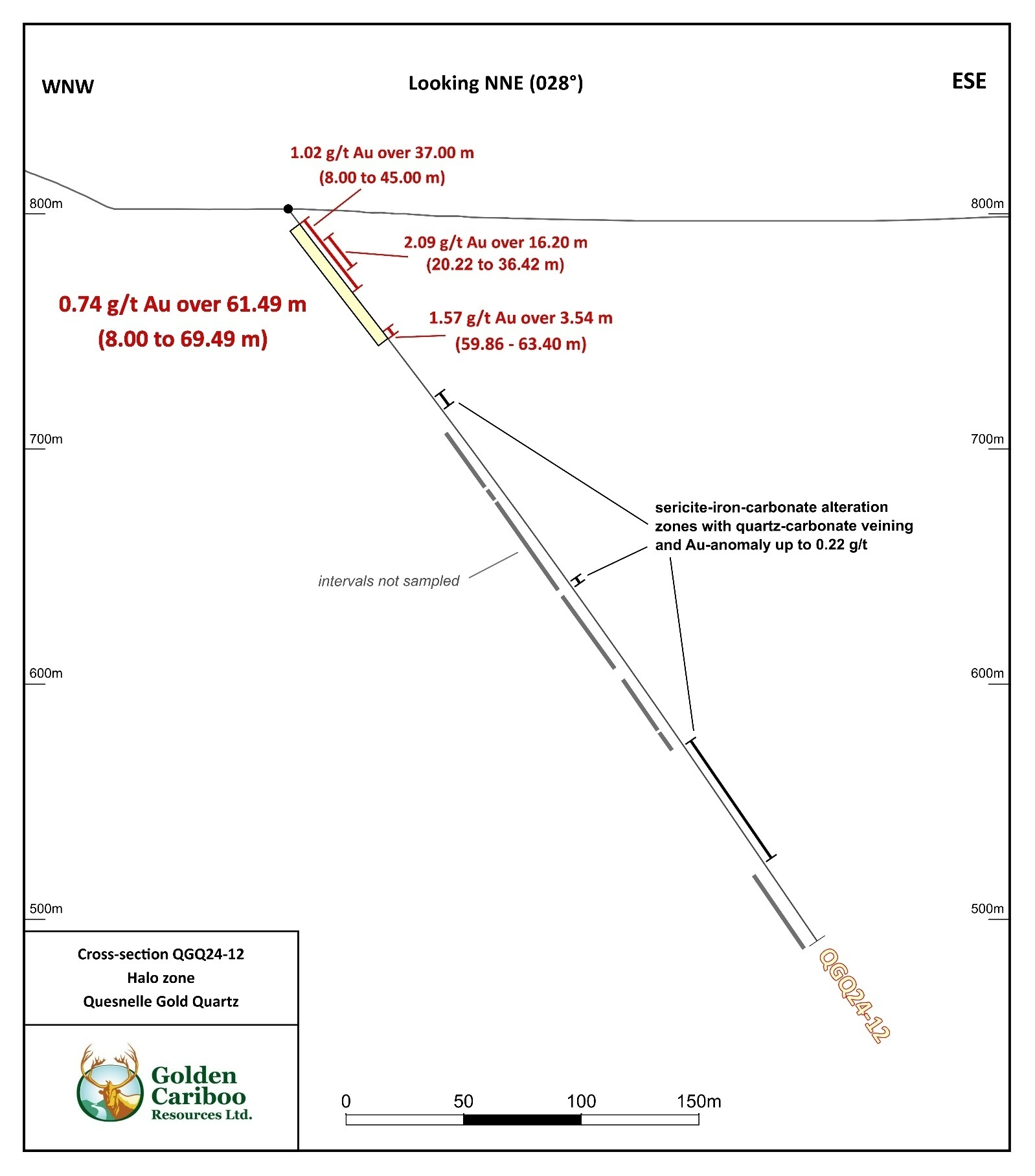 May 20, 2025 – TheNewswire - Vancouver, Canada – Golden Cariboo Resources Ltd. (the “Company”) (CSE:GCC) (OTC:GCCFF) (WKN:A402CQ) (FSE:3TZ) wishes to report assay results from drill hole QGQ24-12 at the Halo zone of the Quesnelle Gold Quartz Mine property (the “Property”), 4 km (2.5 miles) from Hixon, BC, which intersected significant gold mineralization starting from the bedrock surface with 1.02 g/t gold over 37.00 m (121.4 ft) and 1.57 g/t gold over 3.54 m (11.6 ft), both within a broader interval of 0.74 g/t gold over 61.49 m (201.7 ft). Detailed assay results are tabulated in Table 1. Deeper in the hole, several additional alteration zones with quartz-carbonate veining and elevated gold assay values were intersected, demonstrating the strong scale potential of the mineral system.