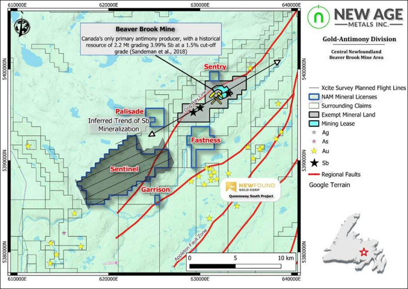 Figure 4: Overview Map of NAM’s Central Newfoundland Au-Sb Projects Showing Planned Xcite Flight Lines Over the Sentinel Property