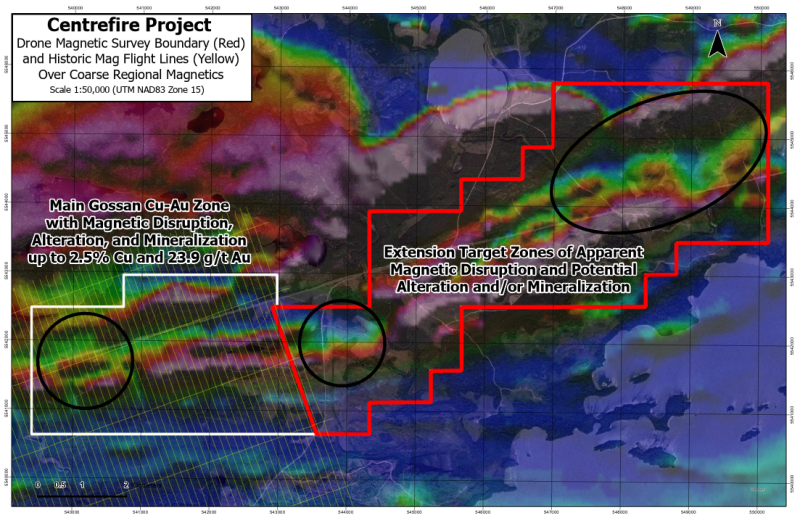 Drone magnetic survey to cover eastward extension of the Main Gossan Copper-Gold Zone at Centrefire.
