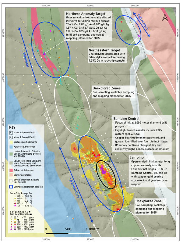 Figure 1: Geology and surface geochemistry map showing the location of the Bambino and Bambino Central anomalies within the broader target area (rock and soil results from News Releases 30th October 2024, 4th September 2024, and 3rd July 2024).