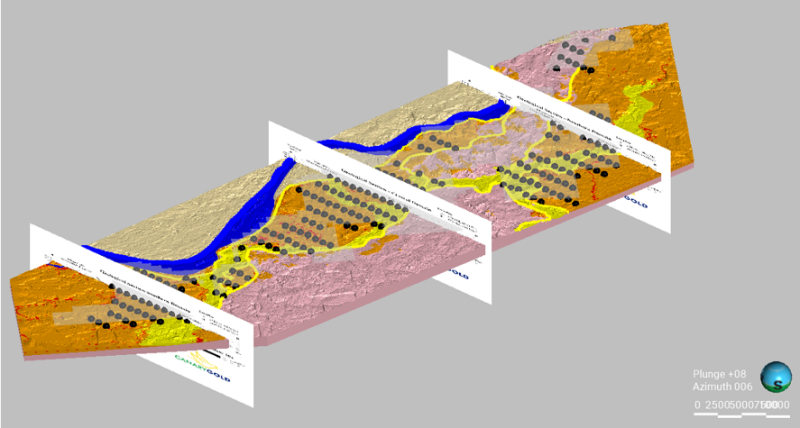 A 457 m sonic drilling campaign achieving continuous core recovery through unconsolidated auriferous sediments, with visible gold grains observed in pan concentrates during sampling;