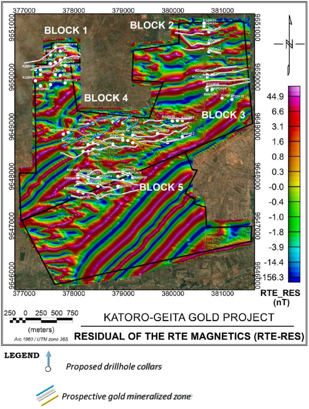 These zones depict three significant trends aligned with the magnetic lineaments interpreted as faults and/or shear zones with the most dominant E-W trend mirroring the Tembo gold deposit of Buckreef Gold Mine.