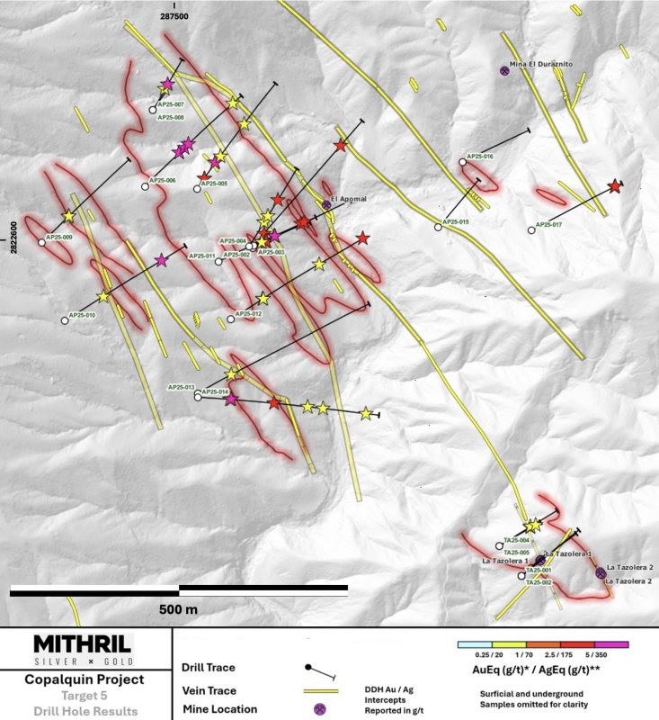 2.75 m @ 660 g/t AgEq (2.28 g/t gold, 500 g/t silver) from 93.6 m (AP25-003), including