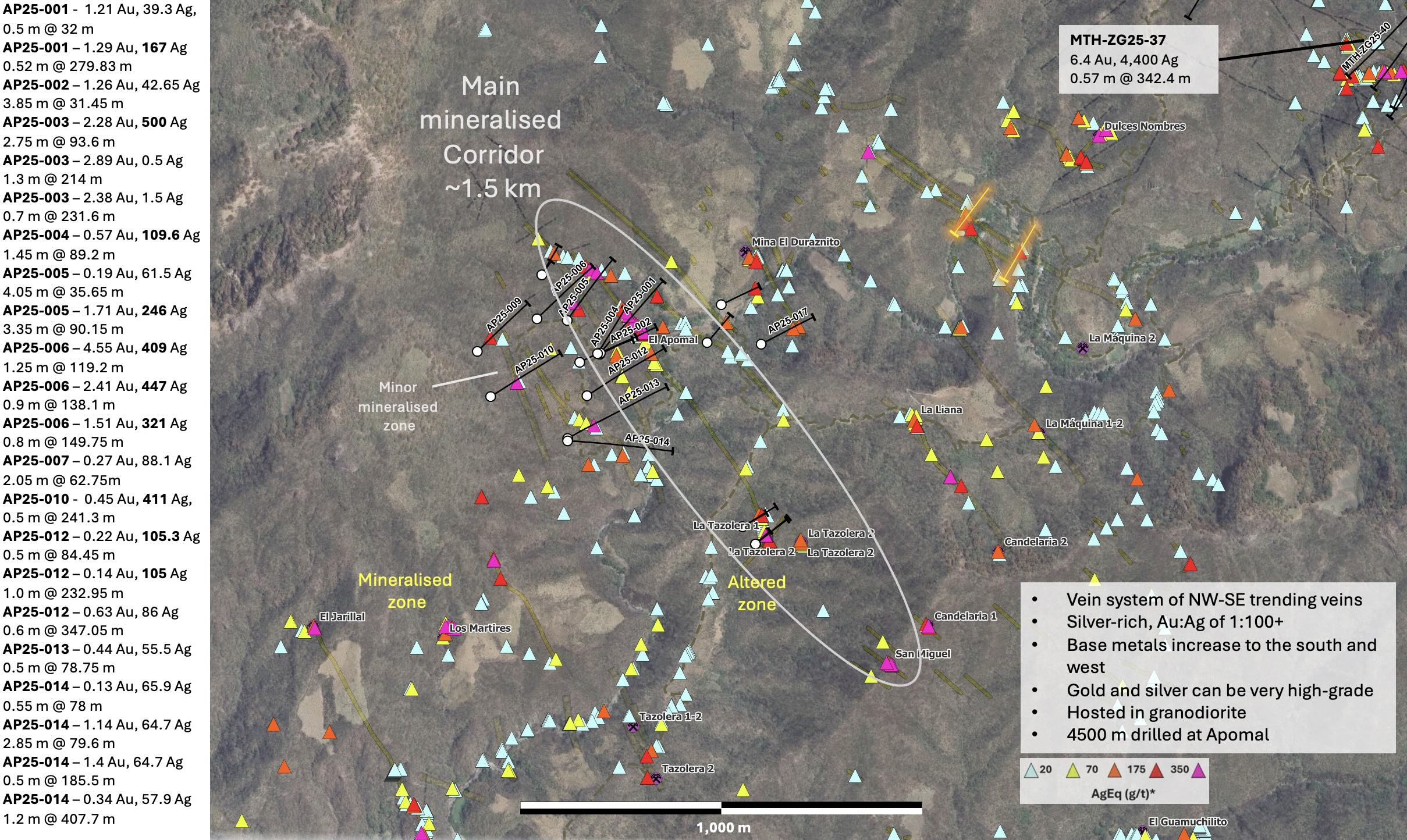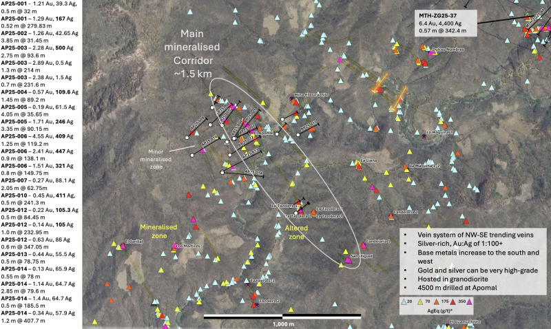2.85 m @ 145g/t AgEq (1.14 g/t gold, 65 g/t silver) from 79.6 m (AP25-014)
