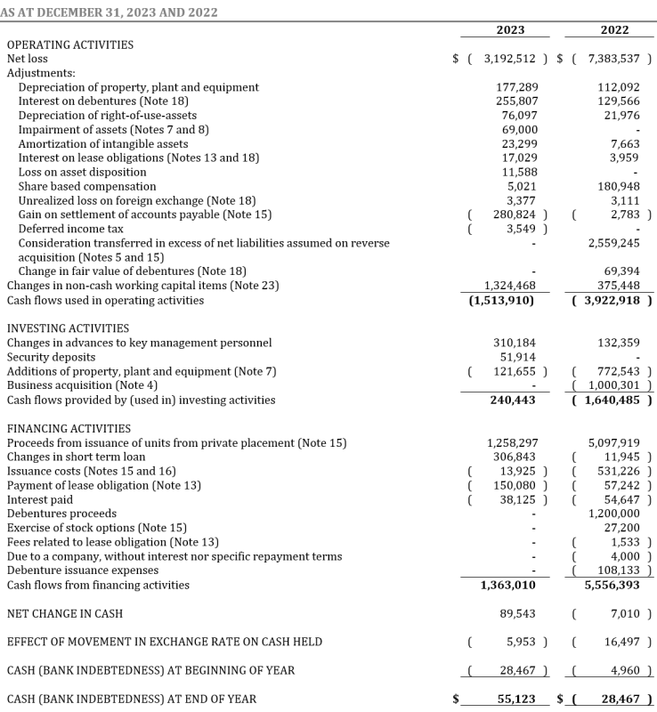 The Company also netted an additional $300,000 in 2023 from Finexcorp financing agreement converted on September 30, 2023, to secured convertible debentures at a deemed price of $0.10.