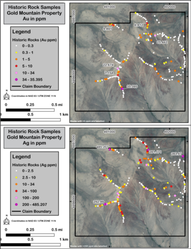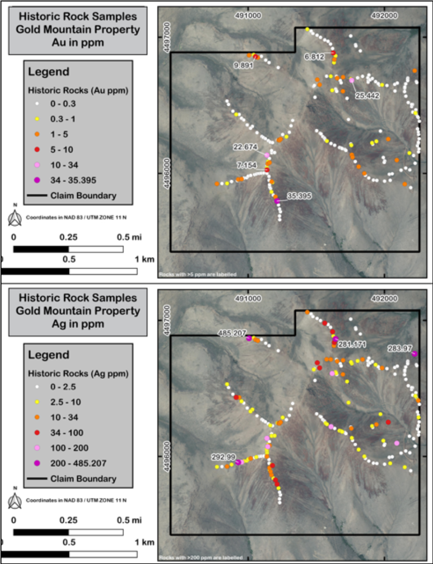Figure 3 - Maps displaying Au and Ag in rocks. The rock samples originated from a hand-drawn map and are thought to have been collected by Oro Nevada and Gold Ventures Inc.