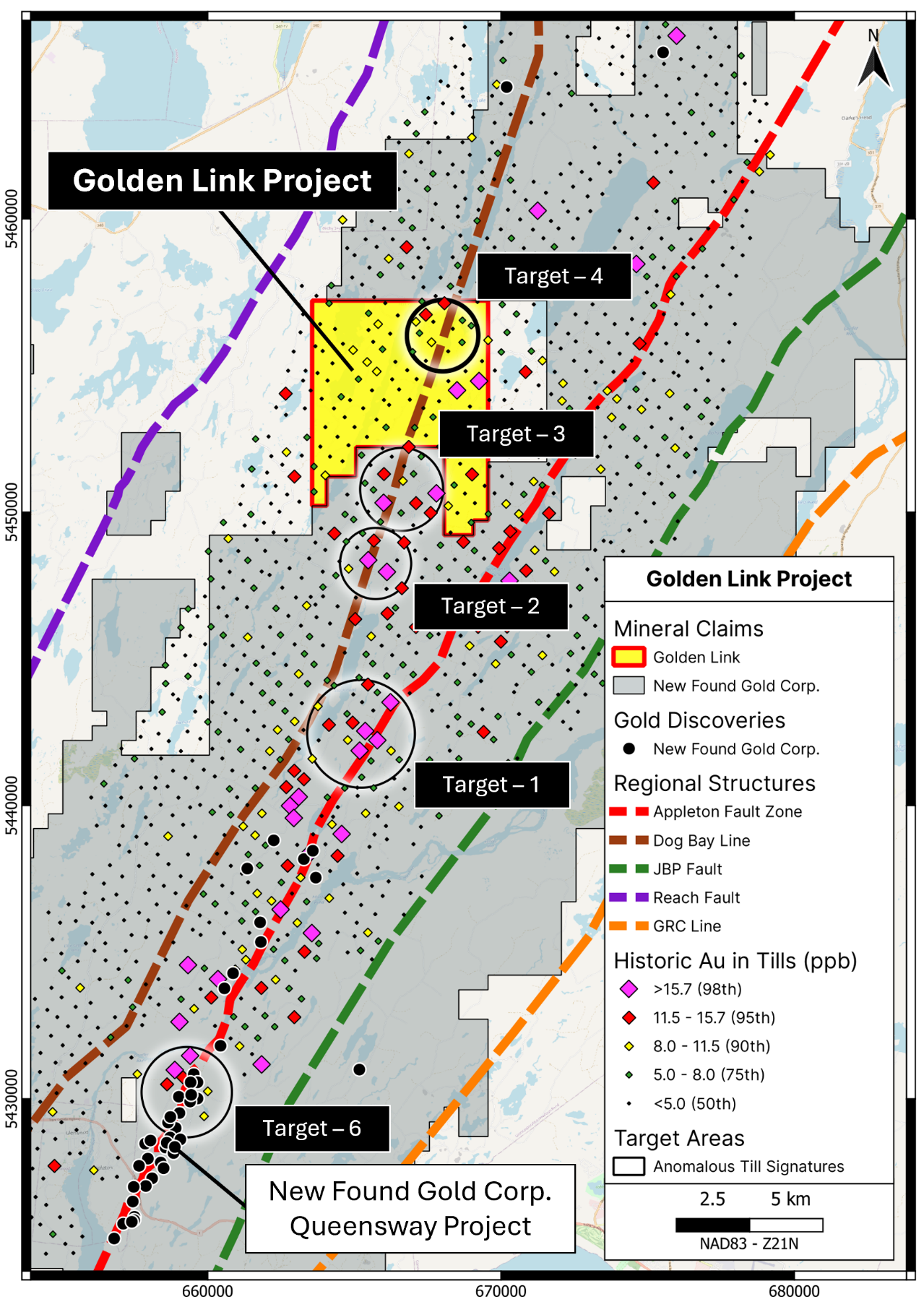This work identified six discrete gold-in-till anomalies distributed along a ~25 kilometre structural corridor parallel to the Dog Bay Line. One of these anomalies, referred to as Target 4, lies directly within the Golden Link Project area. Target 4 was interpreted as a high-priority gold target, spatially associated with major regional structures, including the Dog Bay Line and the Appleton Linear, and supported by coincident geochemical responses from multiple sampling media (Torq Resources, 2018; Heberlein Consulting, 2018.