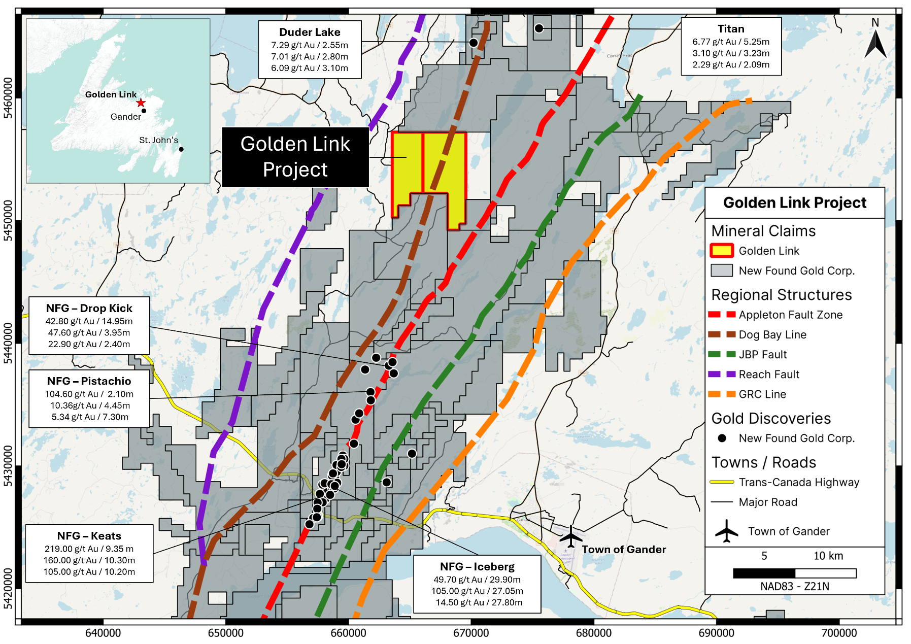 Exploration success in central Newfoundland has rapidly elevated the district’s profile and validated the broader structural framework that the Golden Link Project is targeting. Newfound Gold Corp.’s initial breakthrough at the Keats Zone included the widely cited intercept in discovery hole NFGC-19-01 of 19.0 m grading 92.86 g/t Au (including 285.2 g/t Au over 6.0 m), which helped catalyze renewed exploration interest along the Appleton Fault and adjacent regional structures.