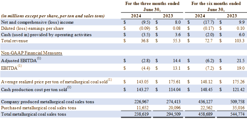 Corsa Coal Announces Financial Results for Second Quarter 2024