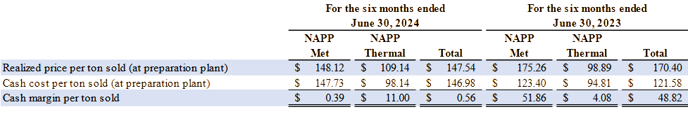 Cash cost per ton sold, cash production cost per ton sold, and cash cost per purchased coal per ton sold for the six months ended June 30, 2024 and 2023