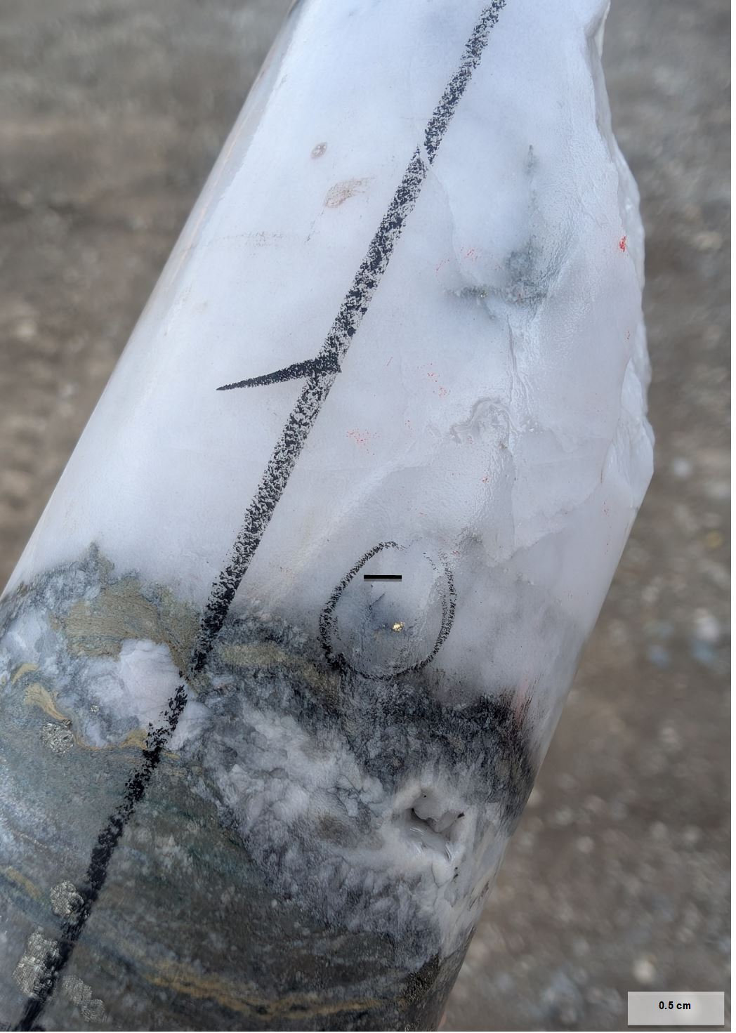 Photo 1: Example of VG in quartz-carbonate vein in QGQ25-23 at 202.4 m (664 ft)