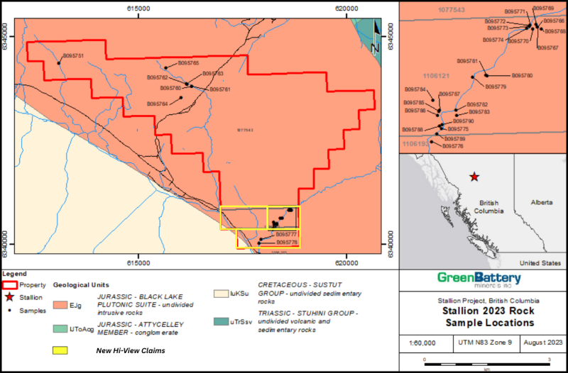 Figure 2. 2023 Rock Sample Locations. Yellow squares indicate newly acquired Chip showing claim boundaries.