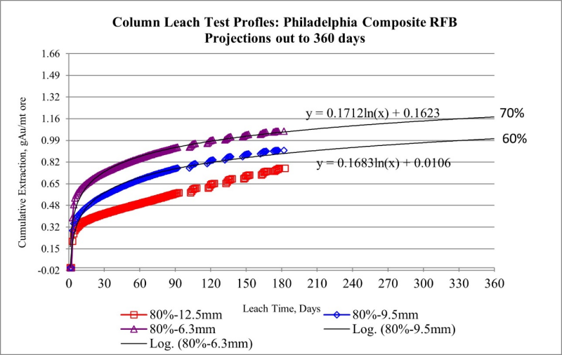 Column leach tests indicated both bulk samples were readily amenable to simulated heap leach at all three crush sizes tested. Extractions improve with finer crush sizes, indicating the -1/4” inch size generated the best extractions over the 177-day leach period of 60.6% to 72.7% for the two samples. Gold was still leaching at the end of the 177-day test period, and the curves suggest gold extractions will improve over a longer leach cycle. Silver extractions were also lower than in agitation leach tests. Regression analysis of the leach curves suggests extraction should reach 70-80% if leaching is extended out to 360 days. Also, due to the silicious nature of the bulk sample material and the lack of significant fines, it is suggested that further test work be performed using HPGR (high pressure grinding rolls) crushing which generates more fine material than conventional crushing and is known to enhance both total extraction and the rate of extraction, and is currently in use at some heap leach operations in the region.