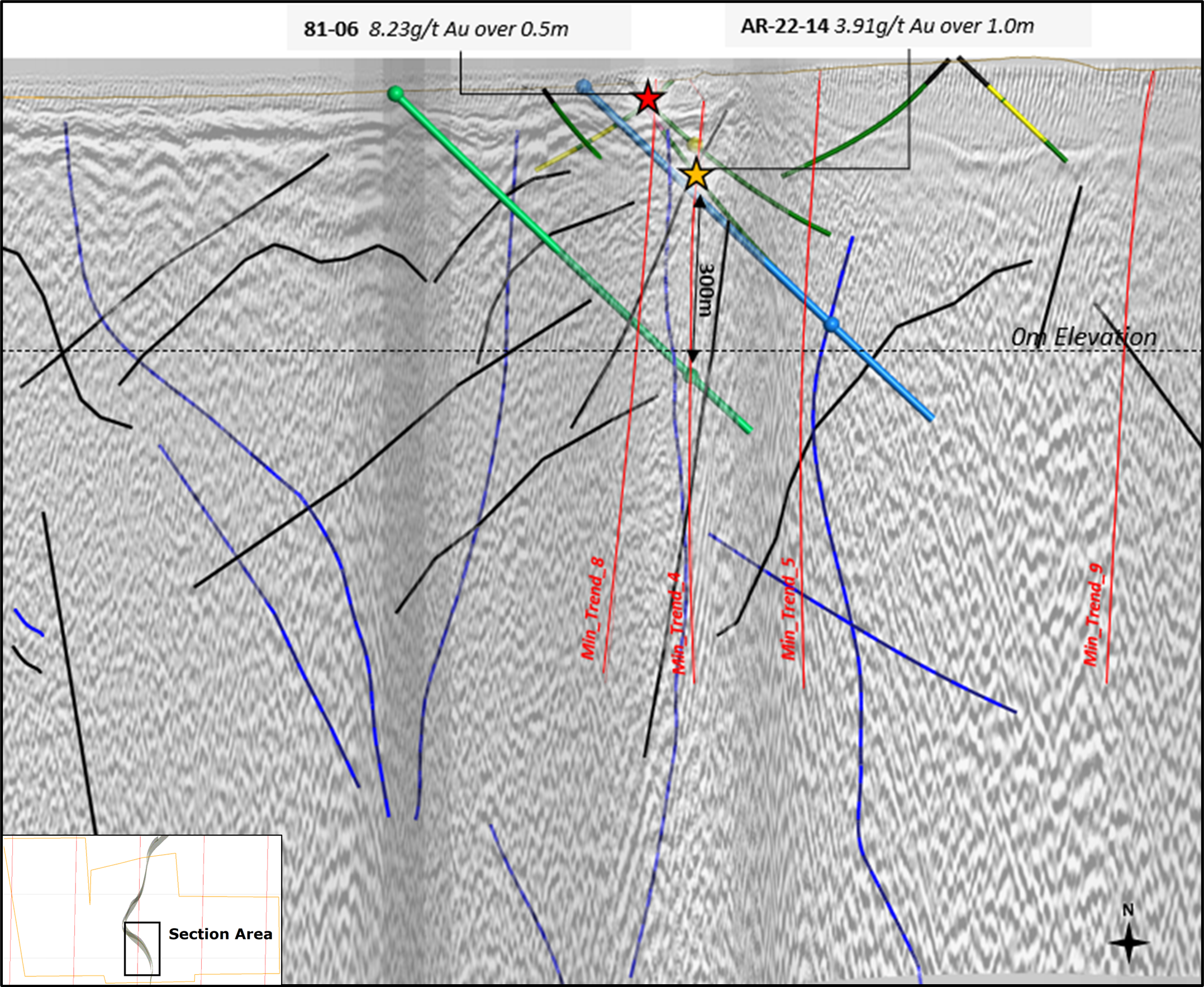 The green projected drill hole is designed to assess mineralized trends 8 and 4 at approximately 300 meters below the blue drill hole (Figure 1). Furthermore, six seismic reflectors (shown in blue and black) will be tested in this context.