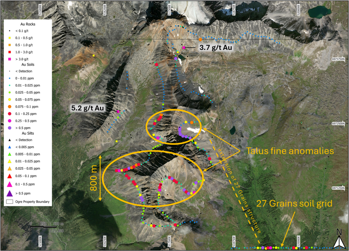Figure 4 – Ogre target surface rock and talus-fine sample gold results.