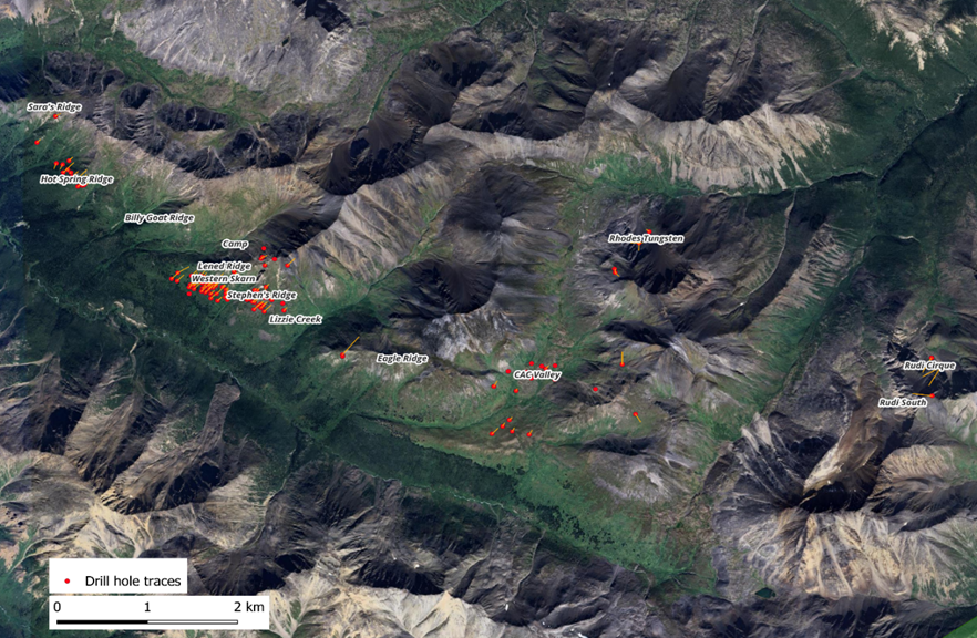 Figure 5 – Lened Tungsten Deposit mineral showings and historical drill hole locations.