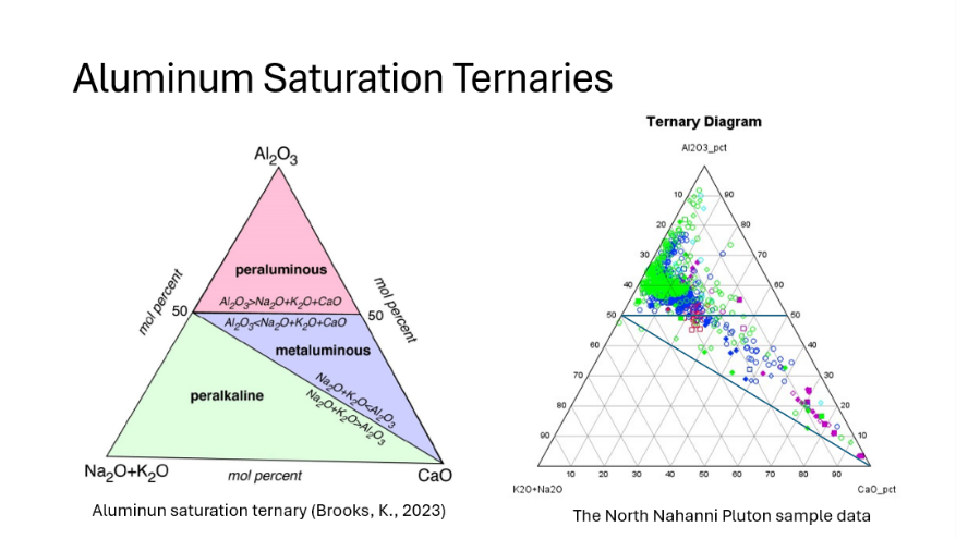 Figure 1 – Aluminium saturation ternary plot for surface samples collected on the North Nahanni Pluton and in drill core.