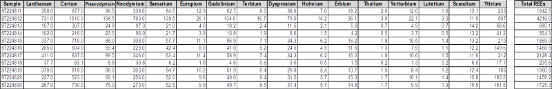 Table 1 – Rackla 2025 stream sediment sample rare earth element results from Lened Creek. (all amounts are ppm)
