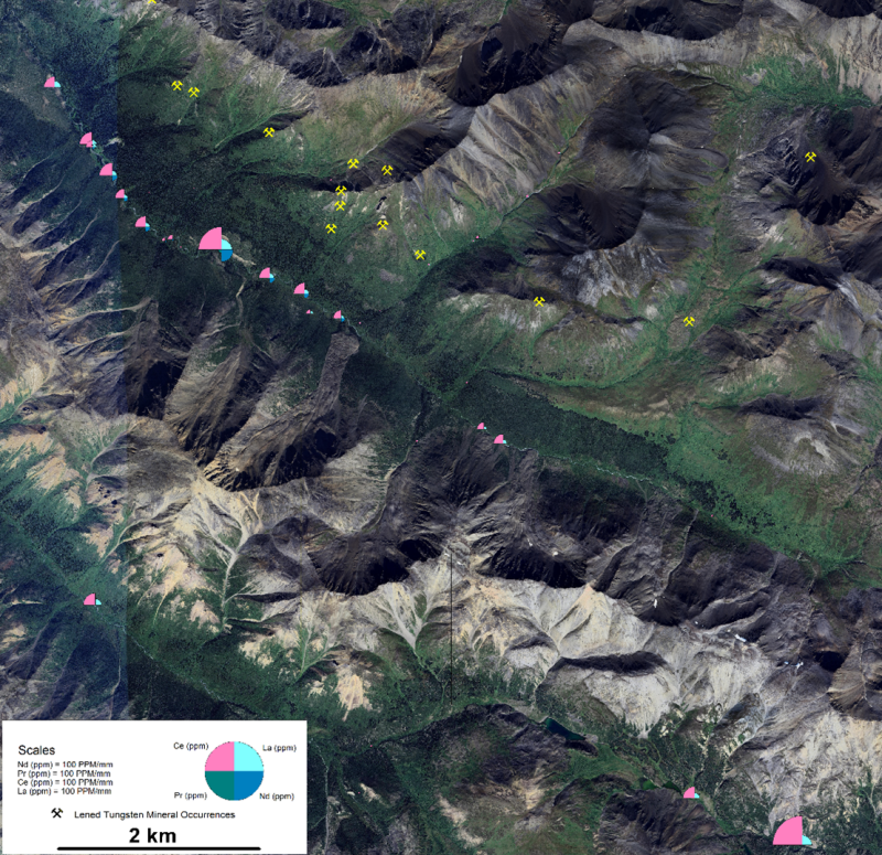 The smaller tributaries draining from the Lened Tungsten Deposit on the northeast side of Lened Creek into Lened Creek were not anomlaous for REEs, indicating that the source does not appear to be associated with the tungsten mineralization. With anomalies isolated to Lened Creek and South Lened Creek, it would appear that the source is the ridge in between. There is no documented history of exploration on this ridge and, at this point, little is known about the geology of the ridge. Government regional geological mapping shows it as underlain by Neoproterozoic phyllite and clastic sediments. The Company suspects that the phyllite and sediments on the ridge may host an orogenic carbonatite complex and plans to test this theory in 2026.