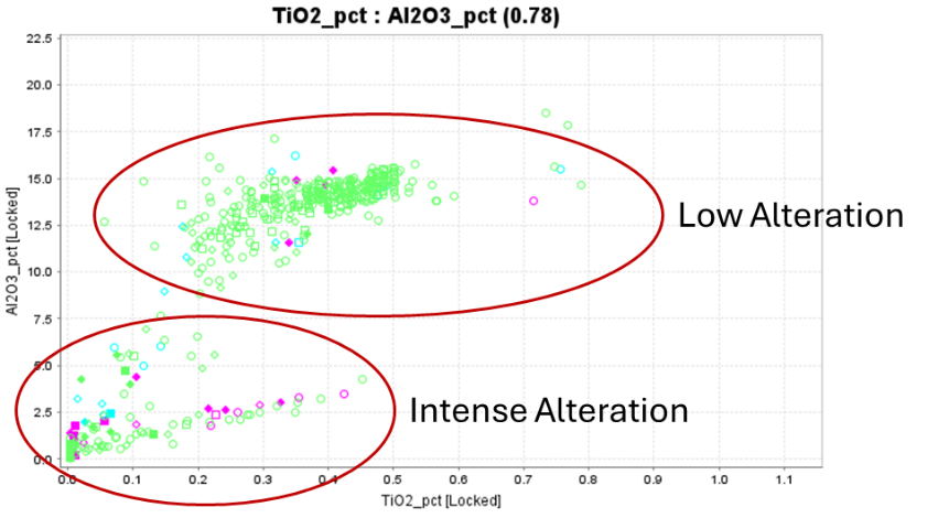 A plot of titanium versus aluminum in Figure 2 also appears to be a useful vector for alteration and can be used as a vector for gold mineralization.