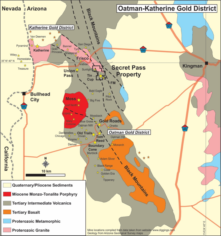 As illustrated on Figure 2, the Secret Pass Project is located in the famous Oatman-Katherine Gold District of northwestern Arizona, close to the Nevada and California State borders. The Oatman-Katherine Gold District was established in 1863 and historically is Arizona’s third largest gold producing area. Between 1870 and 1980 it is estimated the district produced over two million ounces of gold and one million ounces of silver. The district includes many historic mines and workings with over 80 separate mines reporting production. Current operating mines in the area include the Moss mine owned by Northern Vertex Corp., an open pit heap leach operation that reached commercial production in September 2018, and Para Resources Inc. that reported starting underground production at its Gold Roads Project in February 2019.