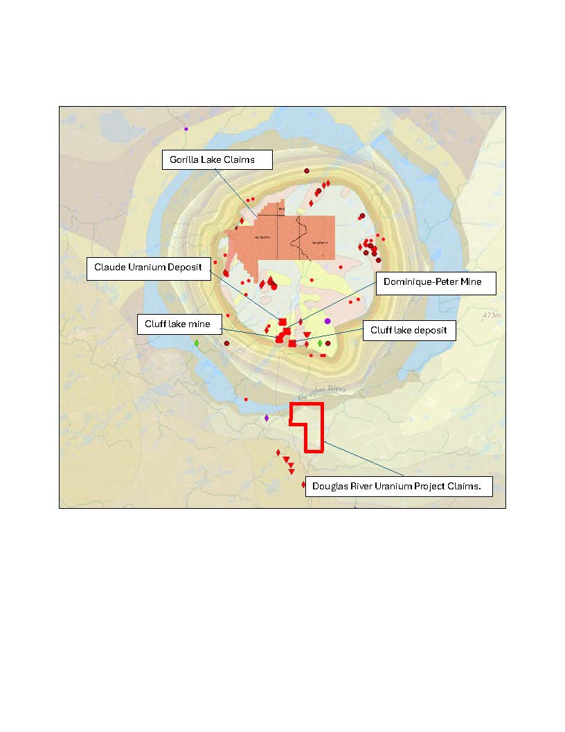 Location of the Douglas River Uranium Project (outlined in red) situated south of the Carswell geological structure and north of the Douglas River corridor, with Gorilla Lake project holdings to the north.