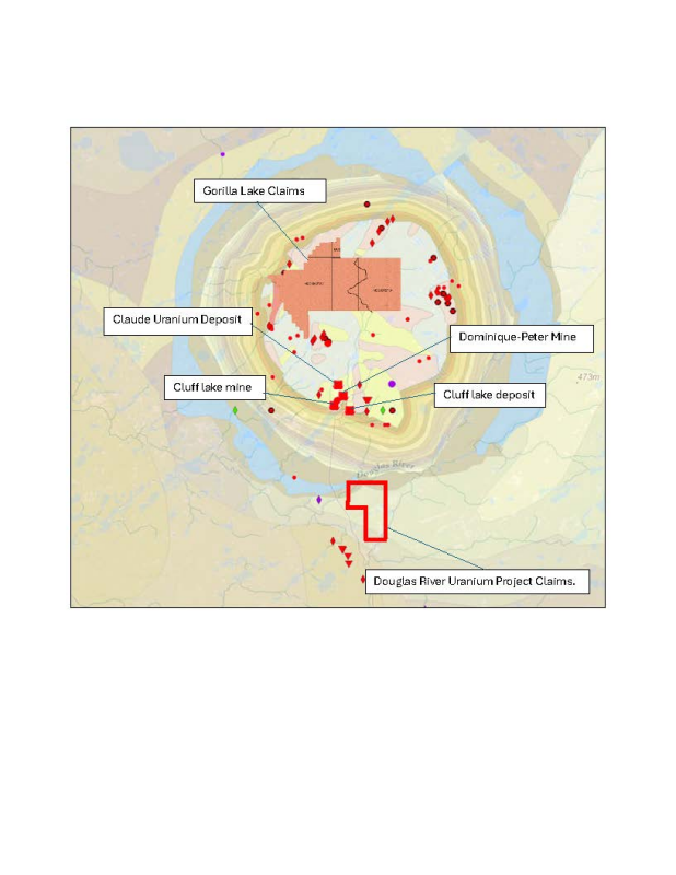 The Douglas River Uranium Project encompasses approximately 1,326 hectares and is situated along the edge of the Carswell meteorite impact multi-ring structure, an area recognized for its geological significance and historical uranium activity. The property lies approximately 7 kilometres south of the decommissioned Cluff Lake uranium mine, which historically produced approximately 62 million pounds of U₃O₈ between 1980 and 2002 (CNSC, 2023).
