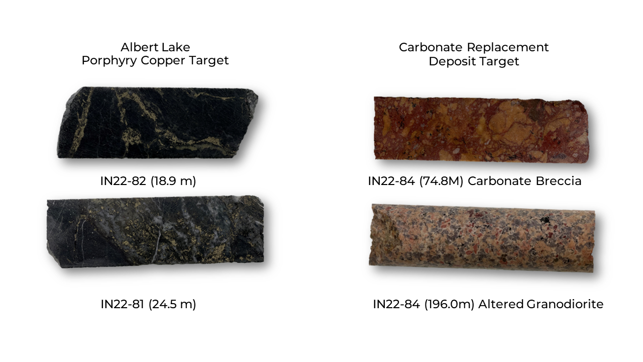 Porphyry copper mineralization was observed in six of the 2022 drill holes, both in the Lake Zone and also in a new area 500 metres to the south. The mineralization is associated with widespread silicification and biotite alteration occurring in chlorite altered Triassic-Jurassic andesite and diorite. Previous drill results from the Lake zone include 27 metres averaging 0.27% Cu in hole 08-I-01 and 0.2% Cu over 148.2 metres in hole 98-4, which includes an interval of 0.37% Cu over 24.1 metres. The Lake zone is currently open for expansion in all directions.