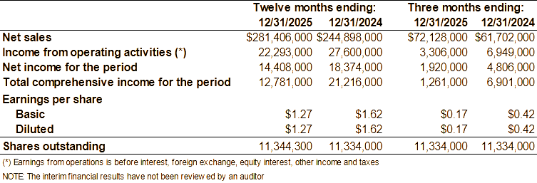 Hammond Manufacturing Company Limited Announces Financial Results For The Fourth Quarter Ending December 31, 2025