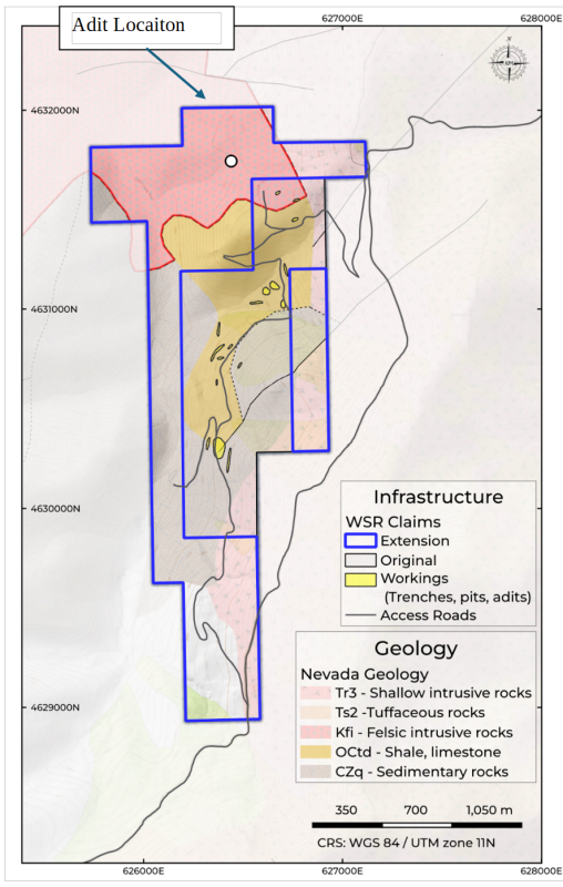 LiDAR data review identified several areas of ground disturbance north of the original claim boundary that were obscured beneath tree cover and invisible on standard satellite imagery. By penetrating the vegetation canopy, LiDAR revealed features consistent with waste dumps. Subsequent review of historical topographic maps confirmed the presence of an adit in this area. Notably, the adit is situated within a zone mapped as dominantly intrusive which in the Rowland setting not typically associated with contact skarn mineralization. The low cost of staking made securing the ground a straightforward and prudent decision adding to the company’s exploration pipeline.
