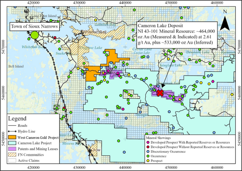 The Project is adjacent to the Cameron Lake claim group, as shown in Figure 1. The Cameron Lake Deposit hosts pit-constrained (0.55 g/t Au cut-off) Measured and Indicated mineral resources of approximately 3.5 million tonnes grading 2.45 g/t Au, containing approximately 274,000 ounces of gold, and pit-constrained Inferred mineral resources of approximately 0.035 million tonnes grading 2.45 g/t Au, containing approximately 3,000 ounces of gold. In addition, the deposit hosts underground (2.00 g/t Au cut-off) Measured and Indicated mineral resources of approximately 2.0 million tonnes grading 2.90 g/t Au, containing approximately 190,000 ounces of gold, and underground Inferred mineral resources of approximately 6.5 million tonnes grading 2.54 g/t Au, containing approximately 530,000 ounces of gold. As disclosed in the Technical Report on the Cameron Gold Deposit, Ontario, Canada (First Mining Finance Corp., effective January 17, 2017). Mineral resources are not mineral reserves and do not have demonstrated economic viability.
