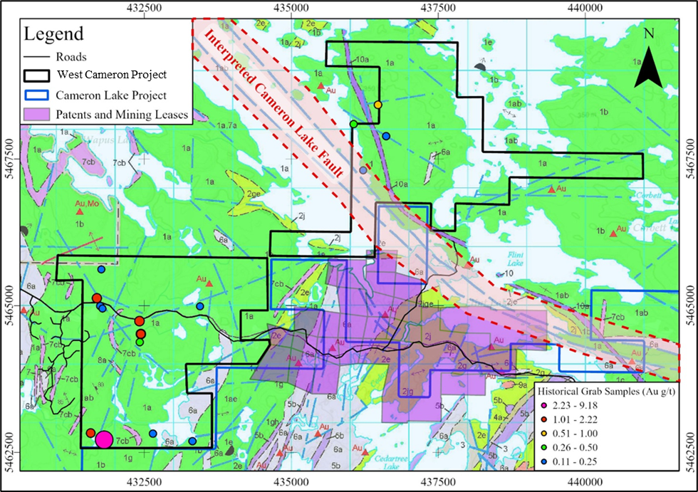 Figure 2: Geological map of the West Cameron Gold Project showing the locations of historical grab samples above 0.5 g/t Au and an interpreted regional structural trend (Cameron Lake trend). Structural features shown are inferred based on historical mapping and geophysical interpretation and are subject to revision with additional work. Regional geological framework adapted in part from the Ontario Geological Survey, Precambrian Geology of the Kakagi–Rowan Lakes Area (Map P.3594), Ontario Ministry of Mines.