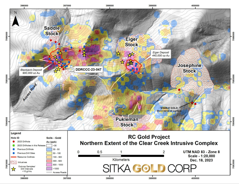 Several high priority intrusion related gold targets exist at RC Gold with nine outcropped intrusions identified to date over the 386 sq km property, however Sitka’s main focus at the RC Gold Project has been on the underlying Clear Creek Property where a large 500 metre by 2000 metre extensional corridor hosting an intrusion related gold system covering the area over the Blackjack, Saddle and Eiger zones was identified. Additional surface work has since extended the gold corridor an additional 3000 metres east and now encompasses the Josephine intrusion. Prior to the onset of the 2023 winter drilling program, the Company had drilled 38 diamond drill holes into this system for a total of approximately 13,000 metres. This drilling culminated in the discovery of the Blackjack and Eiger deposits with an initial inferred mineral resource estimate of 1,340,000 gold ounces(1).