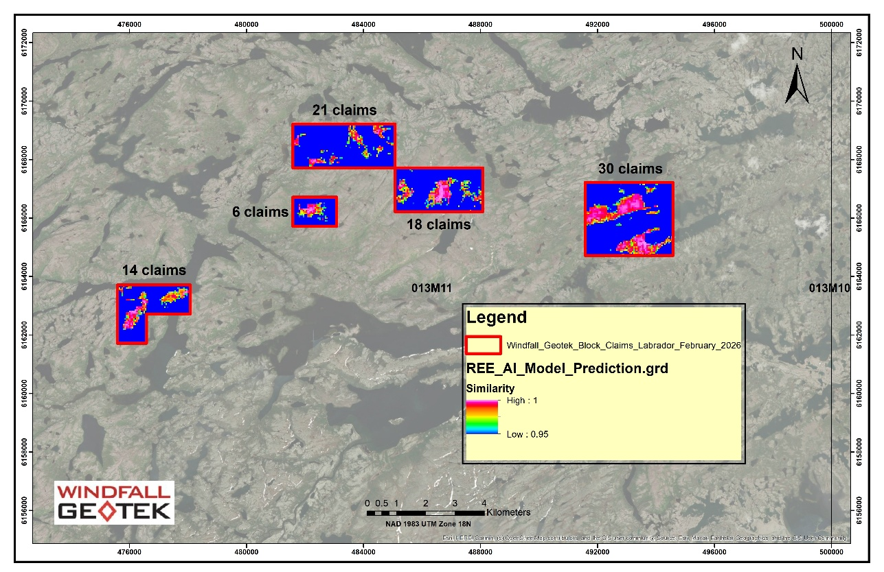 Using its proprietary AI System in combination with a strong historical exploration database and SIGEOM data covering 13, 682 km², Windfall identified 5 high-priority REE target zones in December 2025.