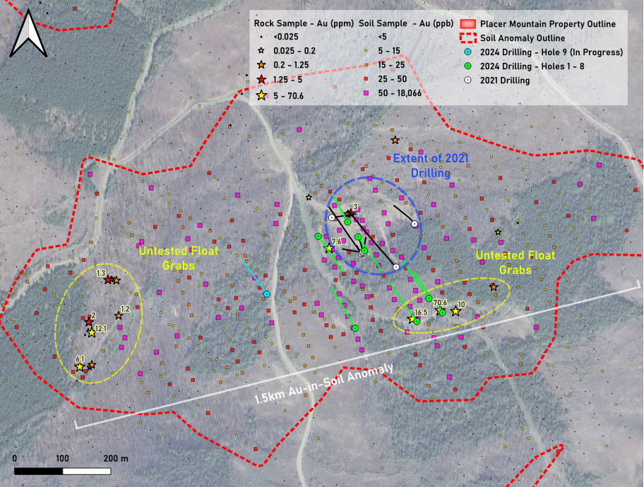 December 4, 2024 – TheNewswire – BRONCO RESOURCES CORP. (TSX-V:BRON) (“Bronco” or the “Company”) is pleased to provide an update to the 2024 drill program at the Company’s Placer Mountain project in Southern BC (“Placer Mountain” or the “Property”). Some 965 meters of drilling have been completed to date in 8 diamond drill holes (Figures 1 & 2). The 2024 drilling program is focused on the large 1.5km by 700m Kodiak Zone gold-in-soil anomaly first discovered in 2021. Core samples from the first 3 holes have been sent to SGS Canada Inc. and results will be provided when received and QAQC has been conducted.