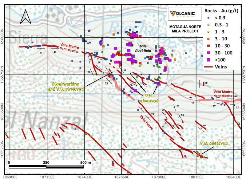 As previously reported (April 3, 2024), drilling confirmed that the broad area of boulder float with abundant bonanza grade assay results discovered by Company geologists at the Mila target is underlain by a serpentinite package, and the colluvial boulders of quartz and schists bearing high-grade gold values have likely moved downslope from a major structural corridor, that includes the Veta Madre Fault.