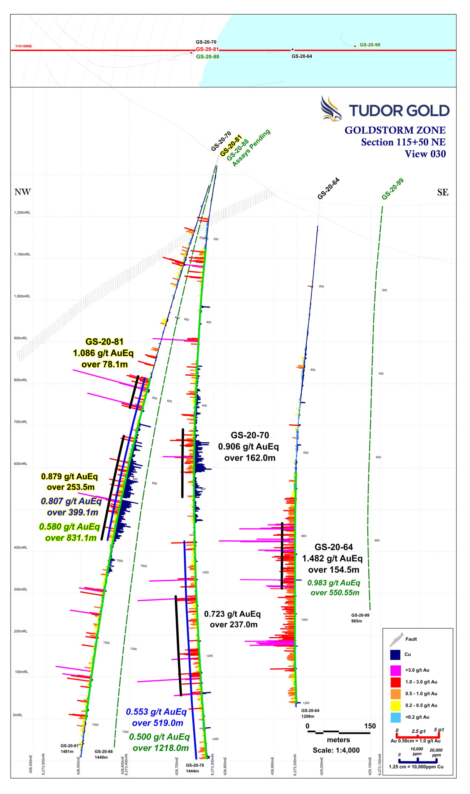 Tudor Gold’s Vice President of Project Development, Ken Konkin, P.Geo., stated: “We are very pleased with the results obtained from all 39 drill holes completed this year to-date and we anticipate the release of the final 11 holes of the year within a few weeks. This brings the total to 50 drill holes that were completed this year at the Goldstorm Zone. These latest holes continued to expand the limits of the mineralized targets along the northeastern and the southeastern axes, and to depth. For a fifth consecutive press release, we have surpassed our best result from last years’ drill hole program (0.697 AuEq over 1081.5 meters in hole GS-19-47) with drill holes GS-20-83 and GS-20-94 as described in the headline. The final 11 drill holes represent over 9600 meters of drilling and we expect that MSA Labs will complete the analysis of these final samples as soon as possible.”