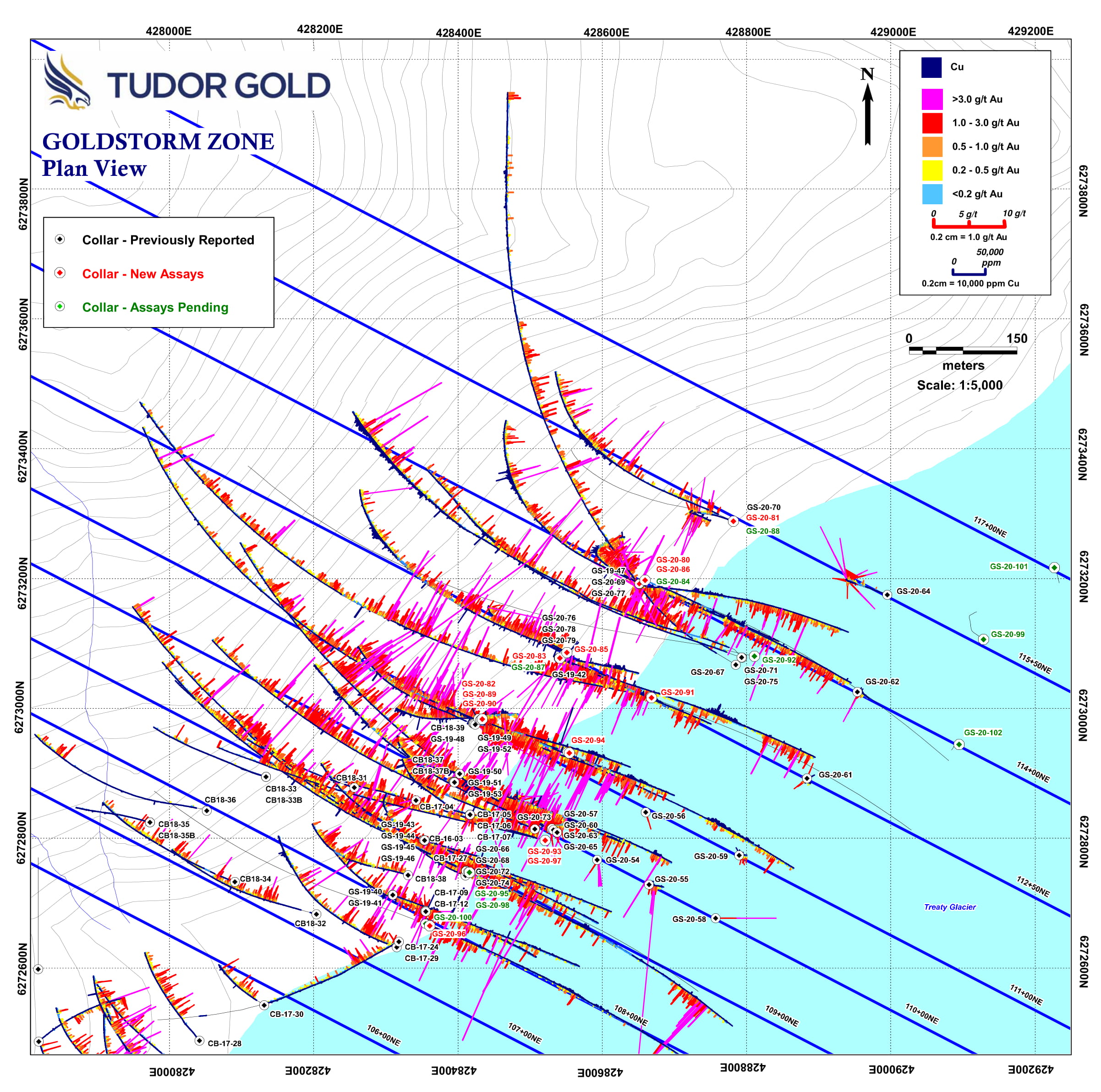Walter Storm, President and CEO of Tudor Gold, stated: “We are very pleased to announce the safe successful completion of our 2020 diamond drill hole program. We completed over four times the amount of drilling from the previous year’s program, greatly advancing Tudor’s flagship Treaty Creek Property. We completed almost 44,000 meters of drilling at the Goldstorm System and over 1,600 meters of drilling at the Perfect Storm target. Once we receive the final results from the last eleven drill holes, we will then pass the data to our resource engineers and geoscientists for an initial resource estimate. Continued drilling is required for 2021 to locate the limits or edges of the mineralized system. Due to the size and robust nature of the mineralization, the Goldstorm System remains open on all fronts and to depth. We are proud of what we have achieved in these last two years of exploration and in-particular, the great effort to withstand the harsh winter elements during November and December at Treaty Creek to bring the 2020 drill campaign to a safe close. Our commitment is to continue to advance the project as quickly as possible. We have left the track-drill carriage components for two track-mounted drill rigs on-site so our team can get an early start to the 2021 drill season. We look forward to receiving the final results of the eleven drill holes from MSA Labs within a couple of weeks to complete the 2020 exploration season on schedule.”