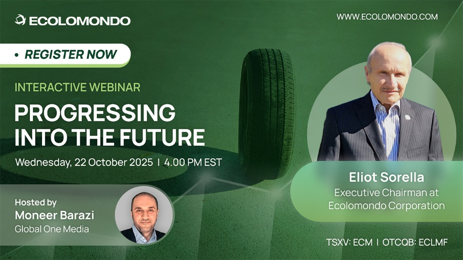 Montreal, QC – TheNewswire - October 10, 2025 -- Ecolomondo Corporation (TSXV: ECM) (OTCQB: ECLMF) (the “Company” or “Ecolomondo”), a leading Canadian innovator in sustainable scrap tire recycling technology, announces an interactive webinar based on the theme “Progressing into the Future”.