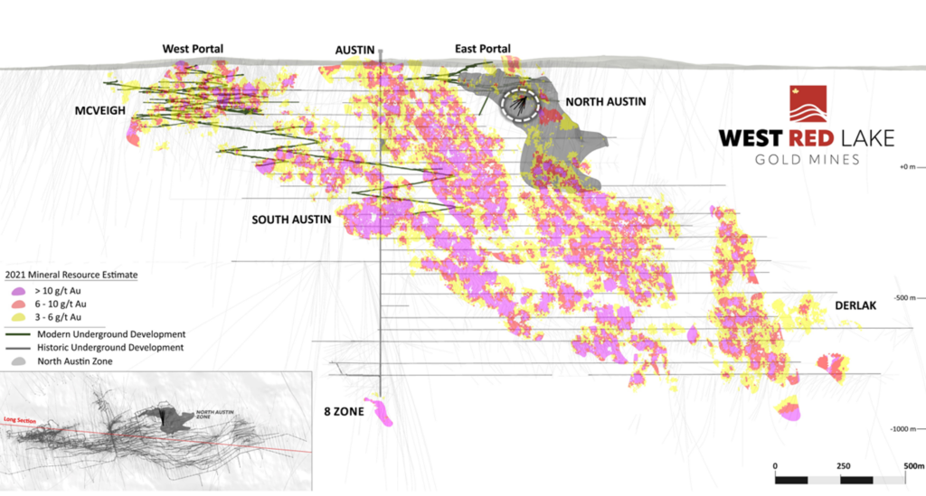 On May 21, 2024 WRLG reported underground drilling results from the North Austin Zone, which represents a new area of high-grade mineralization extending the current Madsen resource to the northeast. This program was designed to expand the North Austin zone down-plunge to the northeast.