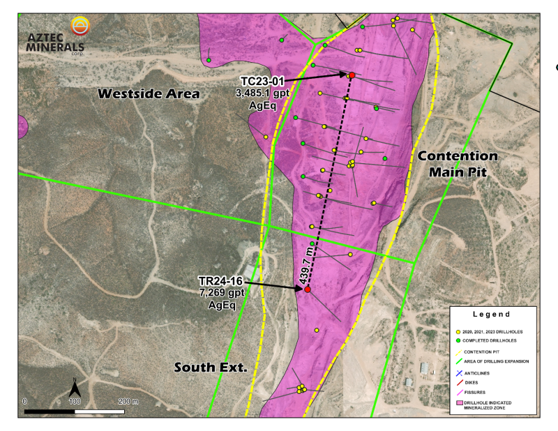 Bonanza grade Silver Intersection in TR24-16 of 7,269 gpt AgEq (233.7 opt AgEq – 3,669 gpt Ag, 44.7 gpt Au) over 1.52 m, within a zone of 569 gpt AgEq (18.3 opt AgEq – 290 gpt Ag, 3.48 gpt Au) over 25.8 m, representing the highest silver grade encountered in drilling to-date by Aztec at the Tombstone Project