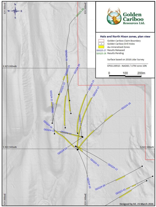 March 25, 2026 – TheNewswire - Vancouver, British Columbia, Canada – Golden Cariboo Resources Ltd. (the “Company”) (CSE:GCC) (OTC:GCCFF) (WKN:A402CQ) (FSE:3TZ) announces that drill hole QGQ25-28 was completed on March 19, 2026 to a total length of 754.69 m (2,476 ft), ending in mineralization approximately 12 m (39.37 ft) from Osisko Development Corp.’s claim boundary. The work was carried out at the Company’s Quesnelle Gold Quartz Mine Property (the “Property”), located approximately 4 kilometers northeast of Hixon and 50 kilometers southeast of Prince George, British Columbia.