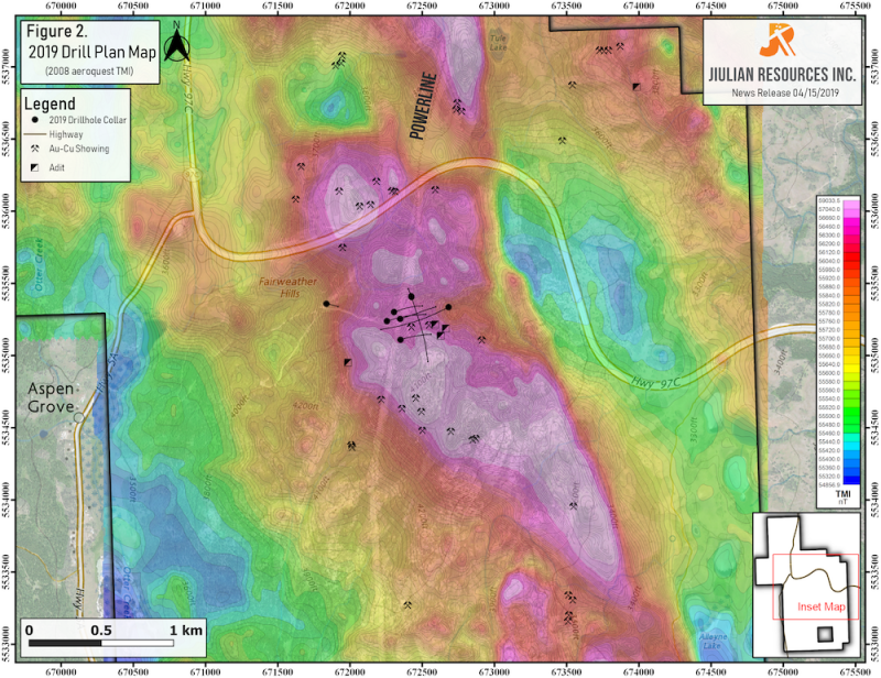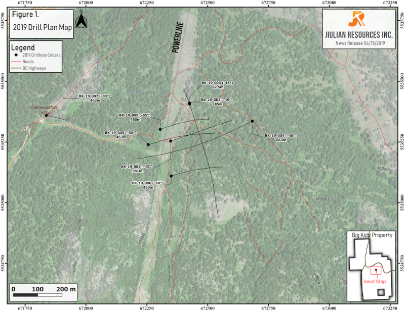 April 15, 2019 / TheNewswire / JIULIAN RESOURCES INC. (TSX-V: JLR) ("Jiulian" or the "Company") is pleased to report initial results for the first two diamond drill holes at its wholly-owned Big Kidd Property (“Big Kidd” or the “Property”), located near Merritt, British Columbia. BK-19-002 returned 0.41g/t AuEq* (0.28g/t Au, 0.09% Cu) over 541m** from 6m downhole. All holes to date have intersected appreciable widths of Au-Cu porphyry style mineralization and alteration. The Company is currently drilling BK-19-009 located 50 meters south of BK-19-004 which is designed to test the Big Kidd Breccia to depths beyond all previous drilling on the Property. Assay results from the remaining holes will be released over the coming weeks as they are received.
