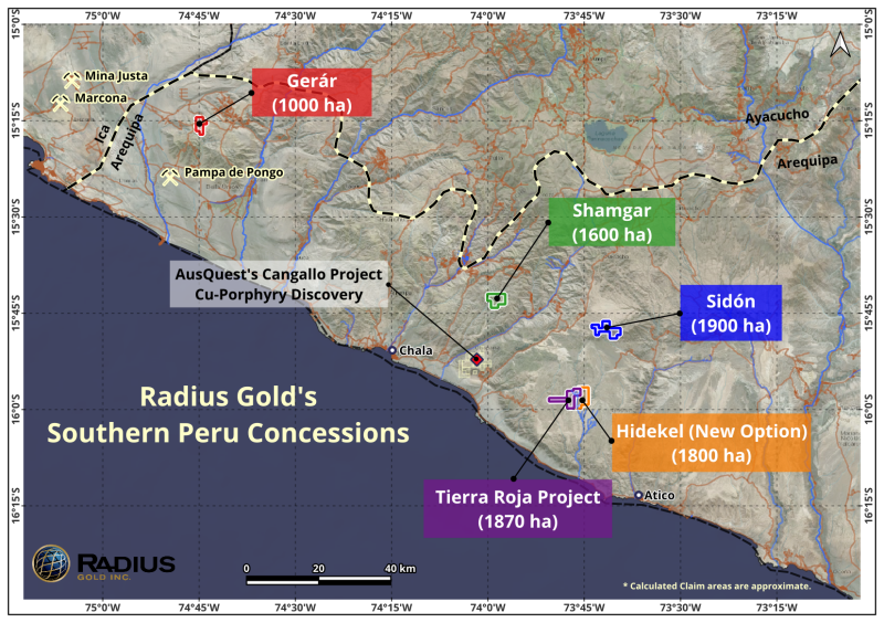 February 28, 2025 – TheNewswire - Vancouver, Canada – Radius Gold Inc. (TSXV: RDU) (“Radius” or the “Company”) is pleased to announce a significant expansion potential for its Tierra Roja copper project, signing an exclusivity agreement and right to option an additional 1,800 hectares (ha) adjoining the project (Figure 1), which would increase the project total to 3,670 ha. Furthermore, the Company has the exclusive right to option an additional 4,500 ha of exploration licenses within the broader district, covering 3 additional targets (Figure 2). With the Tierra Roja project and 3 new properties to explore, Radius has rapidly consolidated a compelling land position in one of the world’s top producing copper belts in southern Peru.