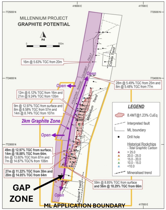 Previous RC drilling of this Gap Zone in 2013 and 2014 demonstrated strong mineralisation continuity on the Millennium Trend, including downhole results of 23m @ 0.48% Cu, 0.16% Co and 0.16g/t Au from 16m (Q-001) and 13m @ 0.53% Cu, 0.30% Co and 0.24g/t Au from 40m (Q-014). The additional lease also encompasses further area to the west to cover potential extensions of graphite mineralisation, and to the east for operational infrastructure.