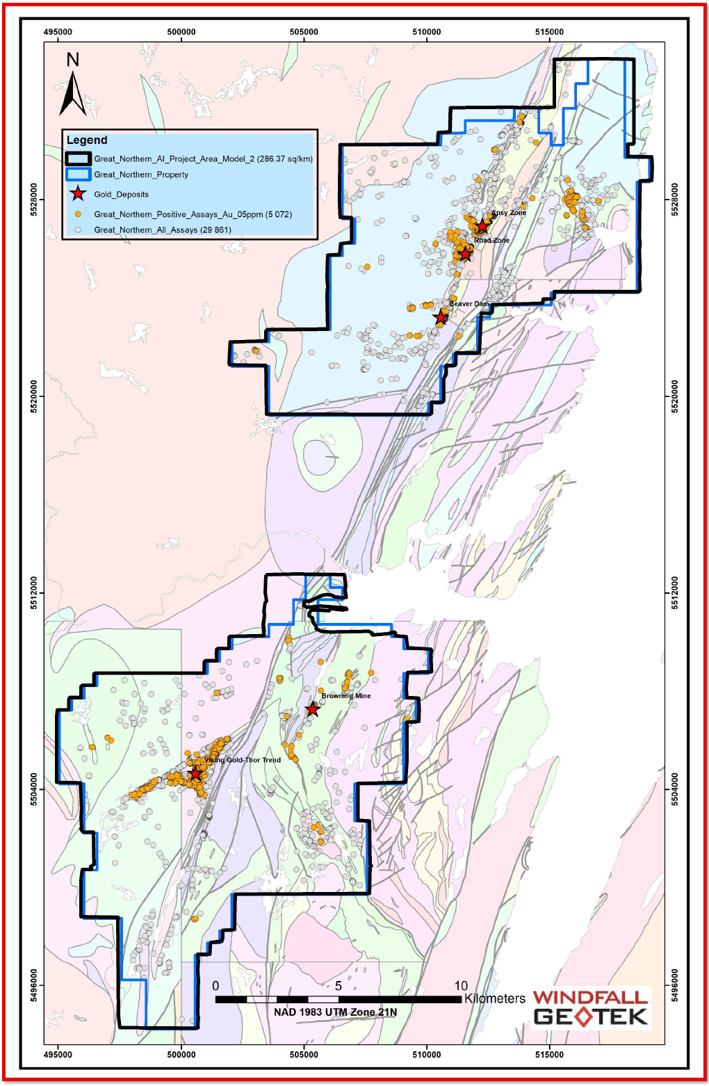 Gold Hunter engaged Windfall Geotek to apply its proprietary AI System across the extensive dataset compiled at the Great Northern Project, drawing on 398 drillholes containing 23,493 gold assays, 7,850 surface rock samples, and geophysical data, including the Company's first-ever district-scale VTEM™ Plus and Horizontal Magnetic Gradiometer survey completed in October 2025. The AI System identifies areas that share geological characteristics with previously reported mineralized occurrences, providing an additional layer of support for the Company’s technical team. Key parameters and results are as follows:
